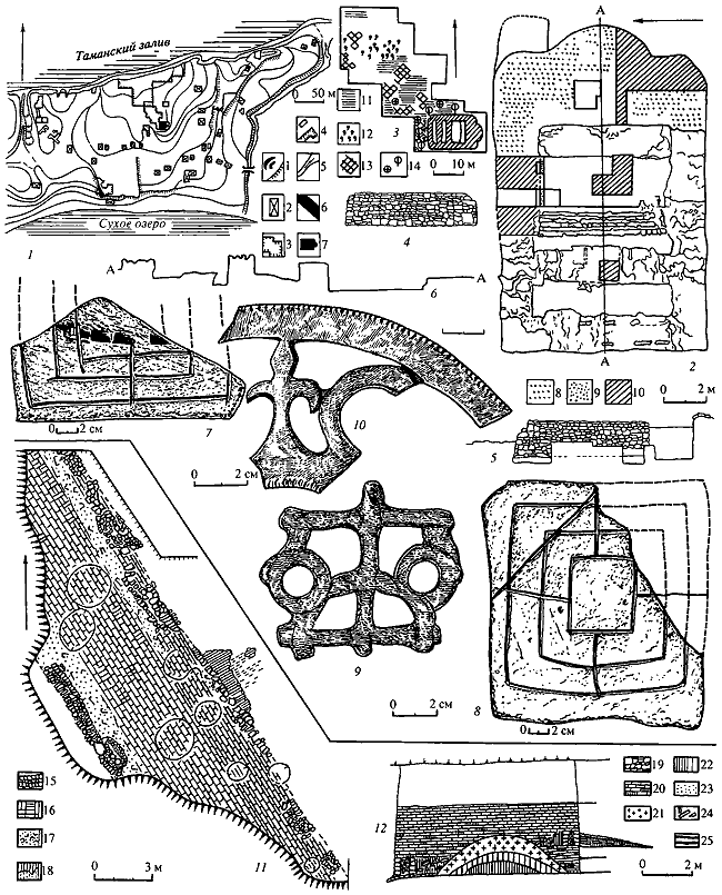 Таблица 65. Планы Таманского городища и обнаруженных на нем фундаментальных построек. Составлена С.А. Плетневой.