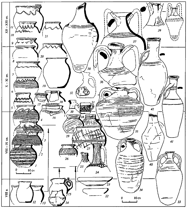1–5 – хазарская кухонная посуда; 6–9 – древнерусская кухонная посуда; 10, 11 – местная гончарная посуда; 12–15 – раннесредневековая лепная посуда; 16–18 – печенего-гузская лепная посуда; 19–21 – местная лепная керамика; 22–23 – краснолаковая посуда; 24-32 – лощеная столовая керамика; 33–39 – амфоры; 40–42 – «тмутараканские» кувшины.