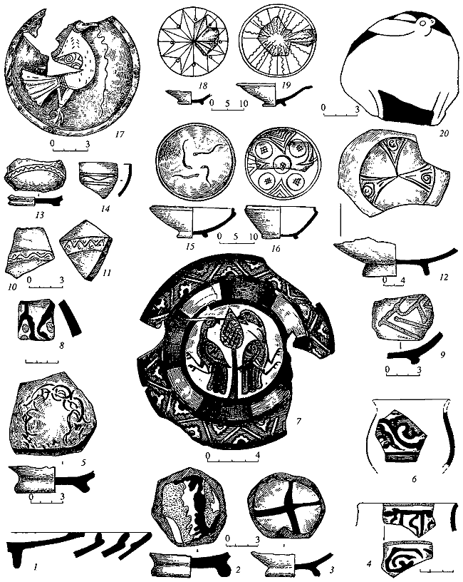 1 – венчики белоглиняных блюд с пятнистой зеленой поливой; 2, 3 – донца белоглиняных чашечек с подглазурной трехцветной росписью под прозрачной поливой; 4 – стенка белоглиняной чашечки с подглазурной росписью черным контуром и подцветкой зеленым и желтым; 5 – донце белоглиняной чашечки с лозой, исполненной пурпурным контуром и подцветкой желтым и зеленым под прозрачной поливой; 6 – стенка белоглиняной чашечки с исполненной черным контуром виноградной лозой с подцветкой желтым и зеленым; 7 – блюдо белоглиняное с пятицветной контурной росписью под прозрачной поливой с изображением двух птиц по сторонам древа жизни; 8 – стенка сосуда из красной глины с росписью коричневым и зеленым цветами по непрозрачной ярко-желтой поливе; 9 – фрагмент поддона белоглиняной чашечки с росписью в виде полос и зигзагов темно-зеленого тона и прожилками красного ангоба («красной пестротой») под прозрачной поливой; 10, 11 – обломки стенок красноглиняных блюд с орнаментом граффито под прозрачной глазурью; 12 – фрагмент поддона красноглиняной чаши с орнаментом граффито под прозрачной глазурью; 13, 14 – поддон и стенка красноглиняных чаш с орнаментом граффито под желтой кроющей поливой; 15 – чаша красноглиняная с четырьмя змеями, выполненными в технике граффито под желтой кроющей поливой (реконструкция); 16 – чаша красноглиняная с орнаментом граффито под желтой кроющей поливой (реконструкция); 17 – чаша красноглиняная с изображением птицы в технике граффито под прозрачной кроющей поливой; 18, 19 – чаши красноглиняные с геометрическим орнаментом в технике граффито под прозрачной кроющей поливой (реконструкция); 20 – днище чаши красной глины с изображением зайца (в выемчатой технике – «в резерве»).