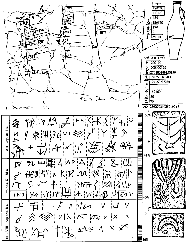 1 – граффити на склеенной из мелких кусочков стенке кувшина; 2 – расшифровка граффити; 3 – кувшин, на стенках которого помещены счетные записи-граффити; 4 – граффити из слоев Таманского городища; справа показано процентное распределение граффити в слоях; 5 – фрагмент иудейского надгробия, на обратной стороне которого изображена тамга; 6 – иудейское надгробие, изображение символики на котором выполнено техникой граффити (прочерчено).
