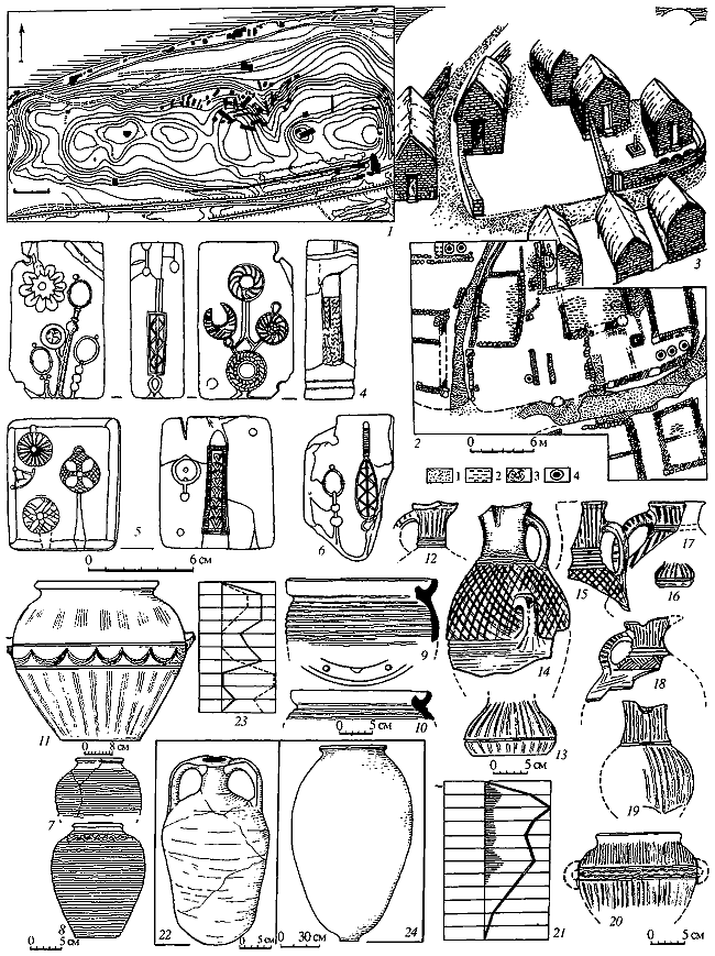 1 – план Фанагорийского городища (черным обозначены раскопанные на городище участки); 2 – план центрального раскопа на уровне VIII–IX вв.; 3 – реконструкция открытого на раскопе участка города; 4 – литейная форма 1; 5 – литейная форма 2; 6 – литейная форма 3; 7, 8 – кухонные гончарные горшки; 9, 10 – венчики котлов с внутренними ушками; 11, 20 – корчаги; 12, 15, 17–19 – кувшины; 14 – трехручный пифос-кувшин; 13 – нижняя часть кувшина или большой кружки; 16 – кубышка с отбитым венчиком; 22 – амфора VIII–IX вв.; 24 – пифос; 23 – график распространения в слое амфор VIII–IX вв. (1) и амфор VII в. (2); 21 – график распространения в слое кухонных горшков и котлов (1) и лощеной посуды (2). Подсчеты произведены по материалам Центрального раскопа.