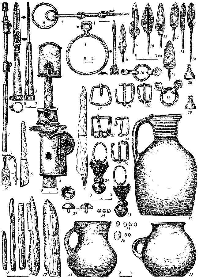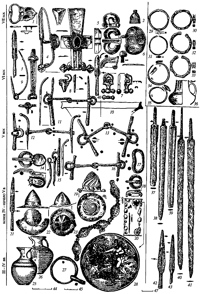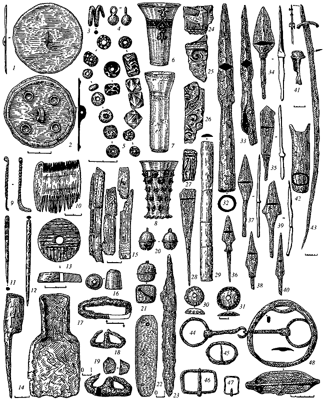 1, 2 – зеркала; 3 – височное кольцо; 4 – пуговка; 5 – бусы; 6–8 – стаканы; 9 – ногтечистка; 10 – гребень; 11, 12 – проколки; 13 – пряслице; 14 – мотыжка; 15, 24–27 – колчанные накладки; 16 – наперсток; 17–19 – кресала; 20, 21 – бубенчики; 22 – оселок; 23 – нож; 28, 34–40 – наконечники стрел; 29 – накладка на лук; 30, 31 – пуговицы-пронизи; 32, 33 – наконечники копий; 41, 43 – сабля и навершие сабельной рукояти; 42 – наконечник сабельных ножен; 44 – удила; 45–47 – сбруйные пряжки; 48 – стремена.