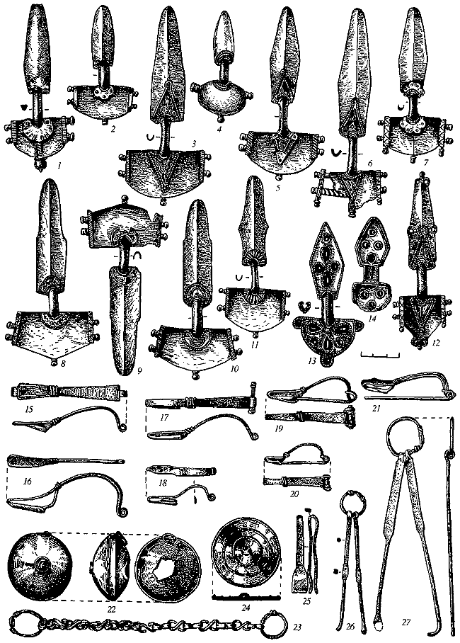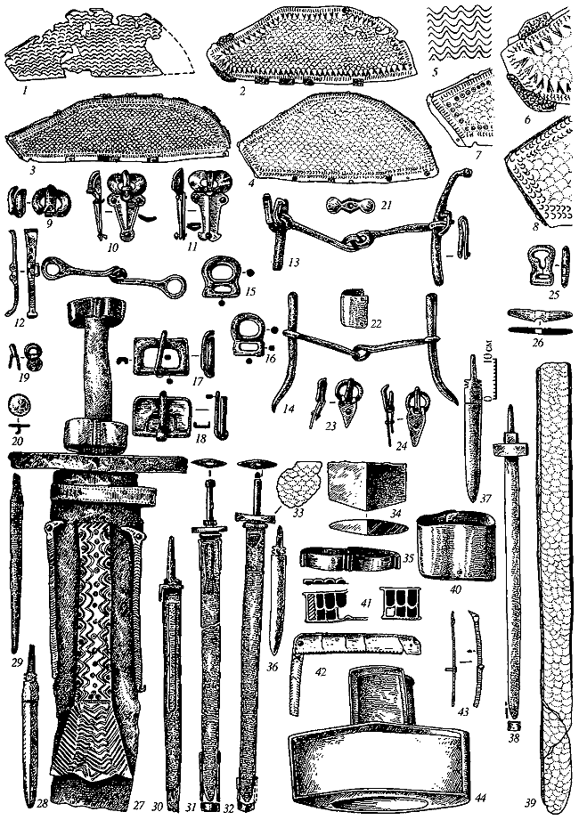 1–7, 11, 18, 19, 27, 28, 38, 44 – железо; 8, 9, 16, 17, 20–26, 29–37, 40, 41 – бронза; 10, 12 – железо с бронзой; 13–15, 39 – бронза с позолотой; 42, 43 – кость.