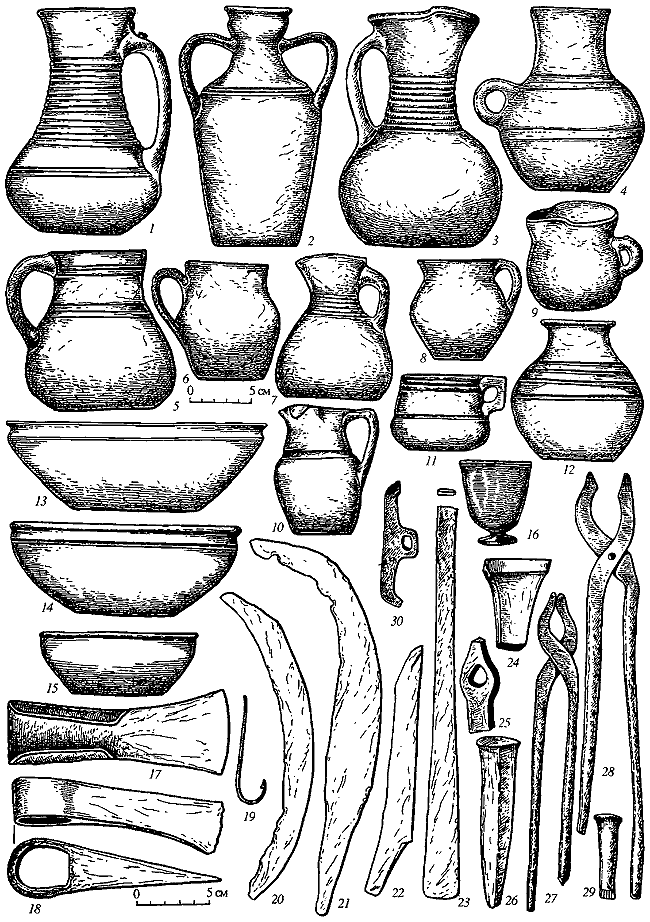 1-15 – глина; 16 – стекло; 17, 18, 20–29, 30 – железо; 19 – бронза.