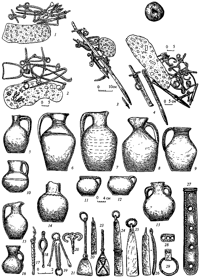 5-16 – глина; 17–20, 27–29 – бронза; 21–26 – железо.