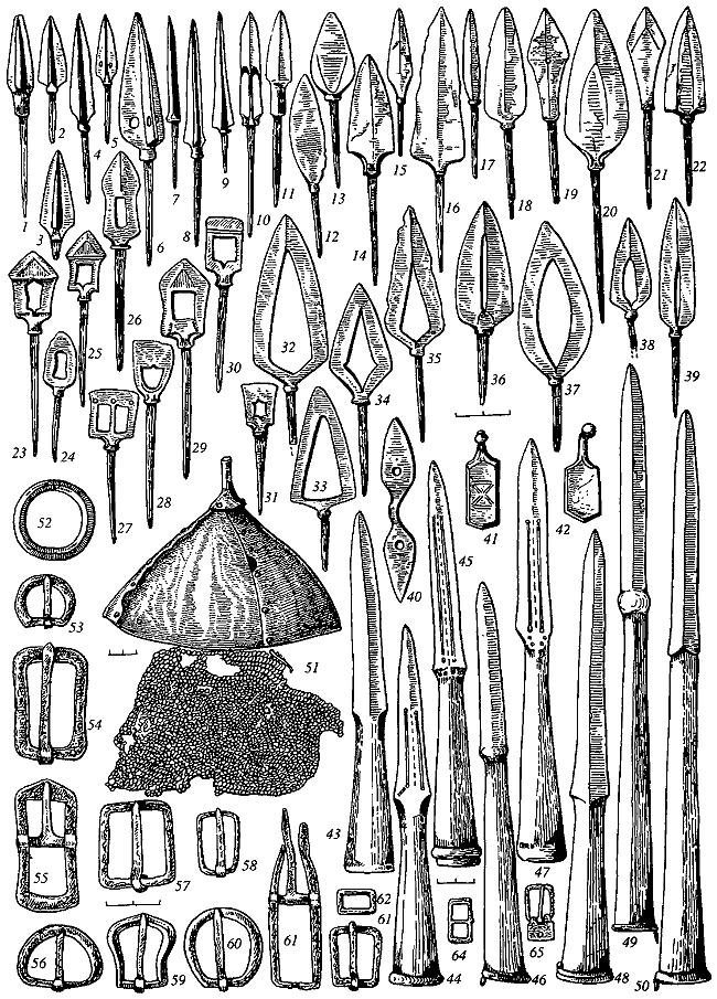 1-39, 42–61, 63–65 – железо; 40, 41, 62 – бронза.