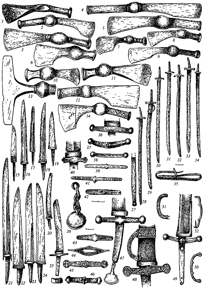 1-34 – железо; 35–37, 41 – бронза; 38–40 – кость.