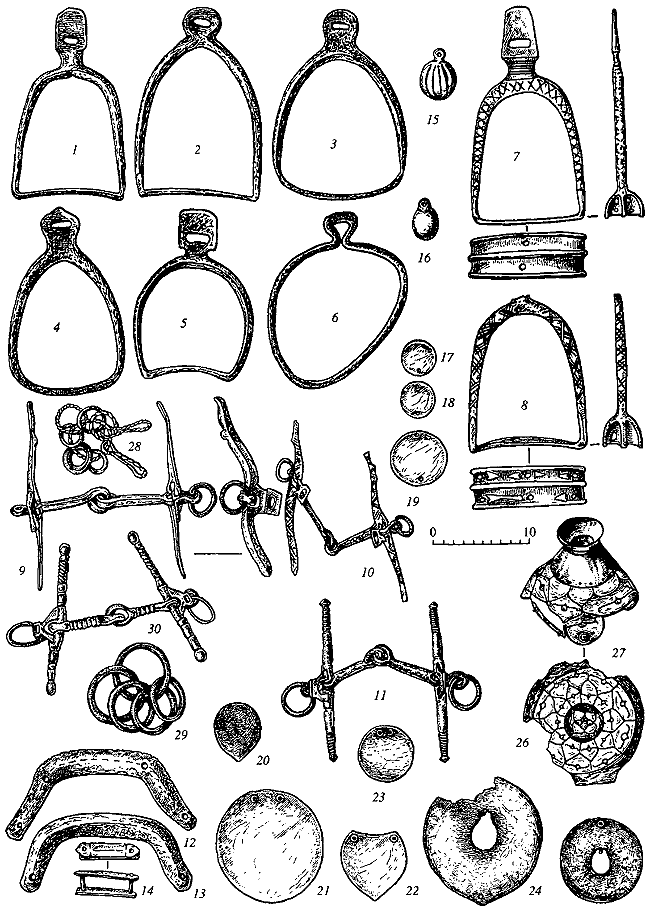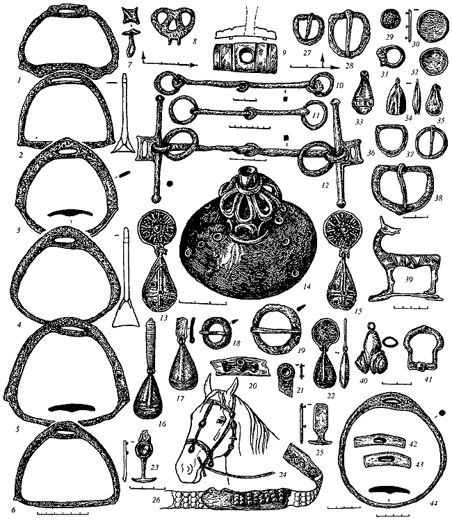 1–6, 44 – стремена; 7 – деталь седла; 8, 13, 15–26, 29, 30, 32–35, 40 – уздечные бляшки-накладки и бубенцы; 10–12 – удила; 18, 19, 27, 28, 36–38, 41 – подпружные и уздечные пряжки; 9 – наносник; 14 – начельник; 24 – реконструкция оголовья; 39 – украшение упряжи; 42, 43 – цурки-застежки.