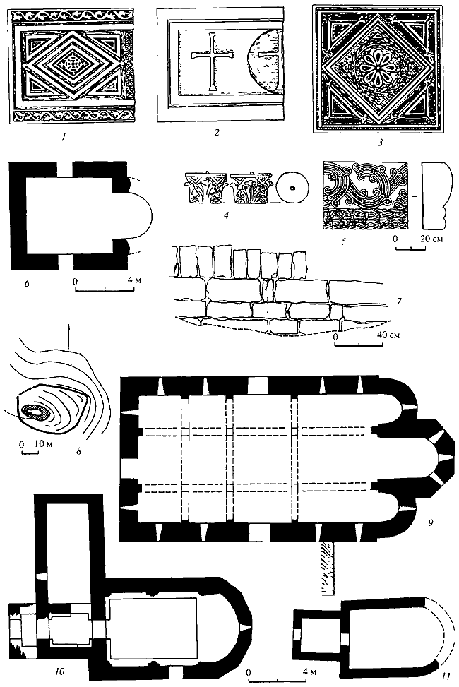 1–3 – резные каменные плиты декора храма в совхозе «Южные культуры» (2 – оборот плиты 1); 4 – капитель из храма в местечке «Каштаны»; 5 – архитектурная деталь храма на Ахун-горе; 6 – план храма у с. Липники; 7 – кладка основания стены алтарной апсиды храма в Липниках, вид изнутри; 9 – план храма в Лоо; 10 – план храма в с. Монастырь; 8, 11 – план Галицынского храма.