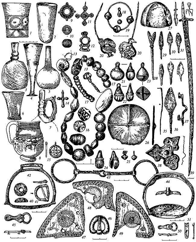 1–8, 10, 16 – стекло; 9, 11, 12, 14, 15, 18, 21–26, 35, 38, 45, 50, 51 – бронза; 13, 17 – стекло, горный хрусталь, сердолик, янтарь; 19–20 – серебро; 27–34, 36, 37, 39, 41–44, 46 – железо; 40, 47–49 – кость.