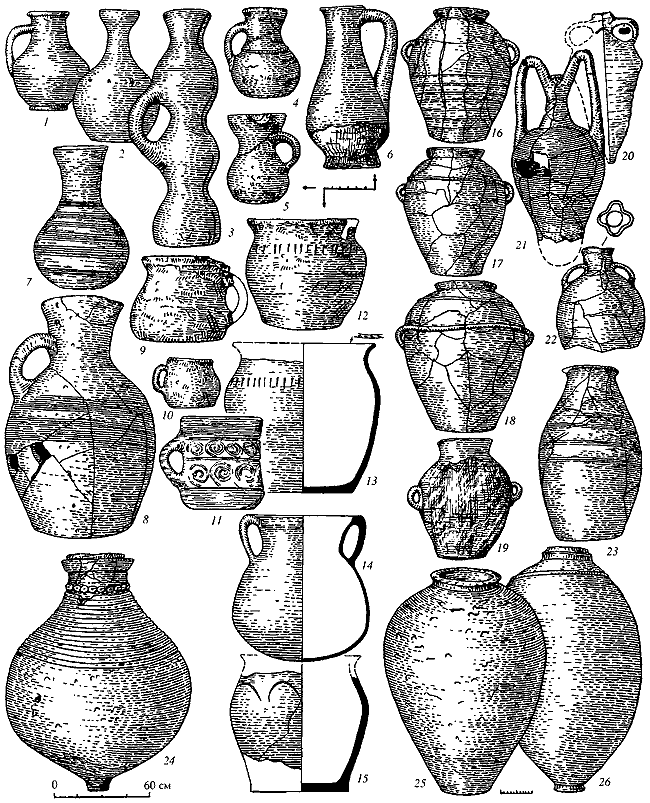 1–5, 7, 8, 22 – круговые красноглиняные кувшины; 6 – белоглиняный кувшин с зеленой поливой; 9, 10, 12, 13, 15 – лепные сосуды; 14 – круговой горшок; 16–19, 23 – урны; 20, 21 – амфоры; 24–26 – пифосы.