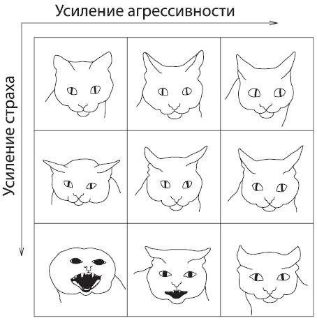 Такого рода дискретные, длительно выдерживаемые сигналы зафиксированы у птиц и рептилий, у млекопитающих же во многих случаях структура коммуникативной системы иная. Может быть, дело в том, что кора больших полушарий головного мозга (неокортекс) дает возможность более эффективного распознавания, может быть, в чем-то еще, но у млекопитающих коммуникативные сигналы часто оказываются континуальными, с бесконечным количеством переходных ступеней от одного сигнала к другому. На рисунке 4.7 изображена мимика домашней кошки, соответствующая разным степеням страха и агрессивности. На схеме показаны лишь по три градации для каждой из эмоций, но, разумеется, кошка не автомат, который резко «перещелкивается» из позиции 1 в позицию 2 и далее в позицию 3. Читатель может сам мысленно достроить то бесконечное количество оттенков обоих этих чувств, которое займет промежуточную позицию между любыми двумя соседними клетками данной схемы.