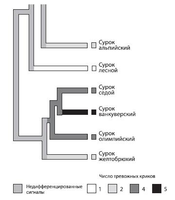 Рис. 4.8. Это родословное древо сурков (род Marmotta) построено на основании молекулярных данных, но по нему видно, что при переходе от более примитивных видов к более прогрессивным число различных сигналов увеличивается61.