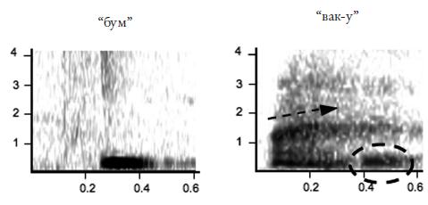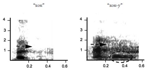 Рис. 4.9. Звуковые сигналы мартышек Кемпбелла (сонограммы). Черная стрелка показывает движение формант; пунктирной рамкой обведен «суффикс» «-у»67.