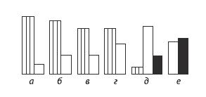 Рис. 4.11. Эти шесть сигналов шимпанзе (выделенных этологом Яаном ван Хооффом) могут, хотя и с различной частотой, выступать в разных ситуациях – и при дружелюбном взаимодействии (заштрихованные столбцы), и для демонстрации подчинения (белые столбцы), и при агрессии (черные столбцы). Относительная высота столбцов отражает частоту, с которой каждый сигнал был зафиксирован в соответствующей ситуации. Сигнал «визг с оскаленными зубами» (д) используется во всех трех типах взаимодействий81.