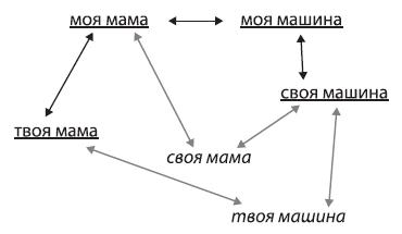 Выучиваемые последовательности слов (так же, как и последовательности морфем) образуют сети, что дает возможность комбинировать отдельные элементы друг с другом. Например, имея в памяти сочетания моя мама, моя машина, твоя мама, своя машина, можно построить своя мама или твоя машина (хотя все равно хорошее владение языком в сильнейшей степени подразумевает знание и употребление таких комбинаций слов, которые в этом языке закреплены традицией – так, в одном языке мы можем попасть в затруднительное положение, а в другом в такой же ситуации – «в тесный угол»: ср. англ. in a tight corner).