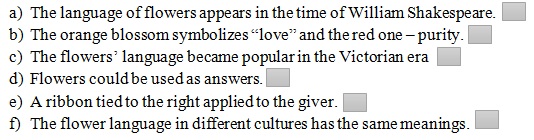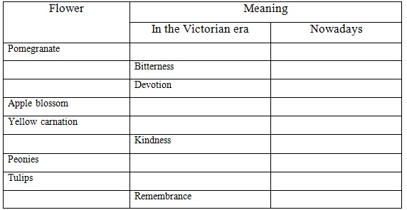 3. Read the text once again and complete first two columns (flower and meaning in the Victorian era) in the table:
