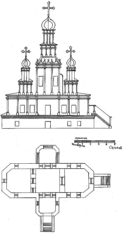 Фасад и план церкви Бориса и Глеба села Зюзина, приложенный к рапорту Пехрянской десятины благочинного священника Романа Стефанова, пославшего запрошенные Синодом документы 13 апреля 1788 г.