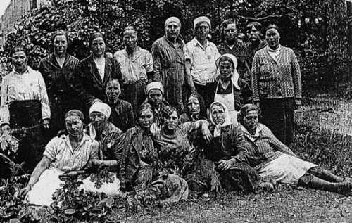 1935 г. Садовая бригада колхоза им. 9 января. В 1-м ряду (слева направо) сидят: И.П. Комраков, бригадир 6-й бригады М.И. Князев, С.М. Гусев; во 2-м ряду справа – агроном Панова (позже Макарова) Н.К.