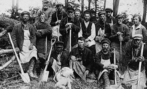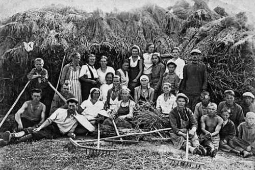 1939 г. На гумне, у большого стога, сложенного из снопов ржи, собрались на обед колхозники, молотившие рожь. Фотография эта была наградой ударнице А.И. Комраковой за хороший труд