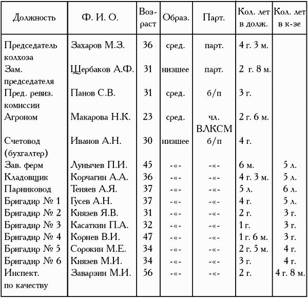 Среднее образование было только у трех человек: председателя колхоза М.З. Захарова, председателя ревизионной комиссии С.В. Панова и агронома Н.К. Макаровой. У всех остальных образование было низшее, или, как позднее стали писать, сельское, т. е. они заканчивали сельскую начальную школу.