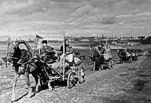 1943 г. С большим напряжением давалась колхозникам сверхплановая сдача картофеля государству, но фронт требовал давать больше продуктов. Обозы шли на Москворецкую базу. На первой телеге стахановцы В.Е. Корнев и К.С. Журина