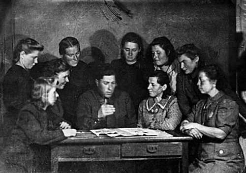 1944 г. Полевая бригада на отдыхе. Как ни тяжел труд полеводов-женщин, а в минуты отдыха их манят цветы, развлекают песни, шутки, улыбки. Посмотрите в глаза этих тружениц – они не плачут, но у каждой война уже взяла свою жертву. 1-й ряд (справа налево): Татьяна Васильевна Корнева – погиб муж Матвей, Мария Васильевна Городилина – ее отец Василий Федорович погиб под Ржевом, Прасковья Спиридонова – муж вернулся с поля боя без обеих ног, Мария Ивановна Чучина – муж Иван погиб. 2-й ряд: Мария Павловна Гусева (мужа на фронт не взяли: пожилой); Клавдия Петровна Князева – муж Яков Васильевич погиб под Ржевом, Анна Петровна Журина – муж Михаил Иванович погиб под Ржевом, Анна Андреевна Королькова – муж Корольков Гавриил Васильевич погибнет в сентябре 1944 г.