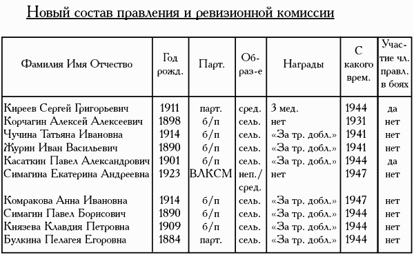 В декабре 1946 г. состоялись перевыборы сельсовета (председателем был избран В.Ф. Пузырев), а в январе 1947 г. – перевыборы правления колхоза, в результате которых в правлении и в ревизионной комиссии оказались те же колхозники, что и были. При этом у большинства была отмечена награда – медаль «За трудовую доблесть» (хотя правильно медаль называлась «За доблестный труд»)[904]904
