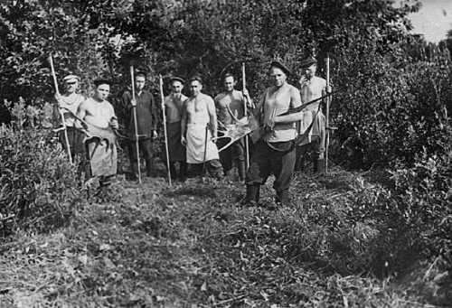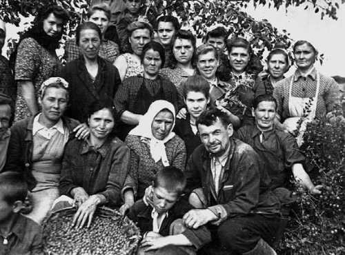 1946 г. Колхоз был садоводческий, и садовая бригада работала всегда. Но на сбор ягод и фруктов приглашали не только женщин, но даже детей и подростков. На снимке: садовая бригада на сборе крыжовника. 1-й ряд (справа налево): А.А. Корчагин (в январе он вернулся из армии; его сын Николай, 1921 г. р., служил на Северном флоте и погиб), мальчик Юра Орлов, Е.С. Фурина, Е.Н. Корнева (муж пропал без вести в 1941 г.); 2-й ряд: Д.И. Бычкова, К.С. Корнева, Е.Е. Фурина (в фартуке), П.А. Корьёва (Морковкина) (в пиджаке), М.В. Городилина (в платке); 3-й ряд: Т. Заварзина (в белом фартуке), М.И. Городилина (муж погиб), М. Ипатенкова (из проживающих), А.В. Корьёва (видно пол-лица), Н.И. Легонькова (муж погиб), К.В. Корьёва, З. Котова, А.П. Журина (за ней на дереве сидит ее племянник Женя Волков), А.П. Касаткина