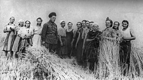 1947 г. Председатель к-за С.Г. Киреев в поле среди колхозниц