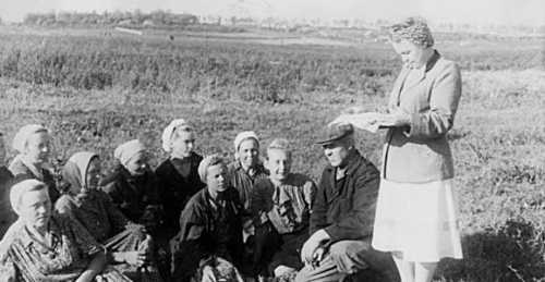 1956 г. Завклубом С.С. Петровская читает газеты колхозной бригаде в поле
