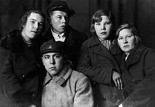 1936 г. М.П. Князев (сидит, в центре снимка) отслужил срочную службу; во 2-м ряду стоят (слева направо): его жена А.Е. Сорокина, брат жены П.Е. Сорокин, сестра М.П. Князева, В.Ф. Князева. После армии Михаил Петрович работал на танковом заводе, где повредил в аварии ногу, после чего хромал и в ВОВ не призывался