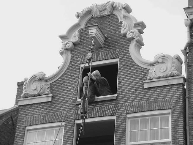 Кроме красивых узорчатых фронтонов, у каждого дома были просторные окна и непременный блок в чердачном окне. Подъемный механизм в таких домах просто необходим по той причине, что лестницы в них настолько узкие, что любую крупную вещь приходится поднимать на блоке и подавать в квартиру через окно.