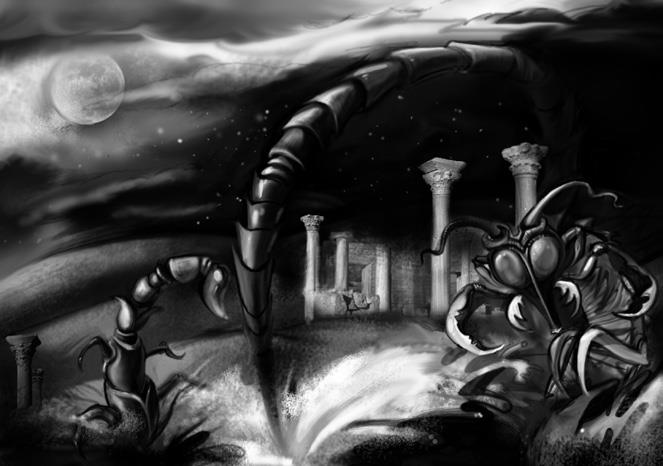 Ночной Город пуст и безмолвен, лишь качается, скрипит на ветру возле колодца одинокий фонарь с горящей внутри свечой. Над Городом – огромная, на половину неба, луна. Кажется, что весь песок в пустыне шевелится в её холодном свечении, рвётся в небо.