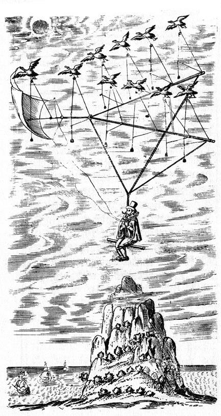 Вот так! За семьдесят три года до того, как Ньютон откроет закон всемирного тяготения. А сеньор Гонсалес им уже воспользовался. И ещё как! По словам автора, самолётная повозка бесшабашного испанца неслась со скоростью никак не меньше 50 льё в час! То есть за 200 км!