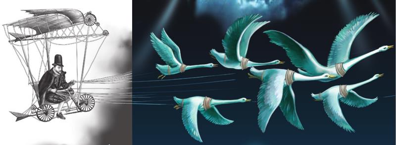 Но ведь наш отважный путешественник, согласно книге, на Луну и не собирался. Да, он вначале сконструировал, а затем и создал действующий образец самолётной коляски типа велодельтаплана на лебединой, скажем так, тяге и собирался использовать её в транспортных целях на малой высоте на небольшие расстояния. Но случилось так, что однажды, при весьма и весьма форс-мажорных обстоятельствах, лебеди понесли!..