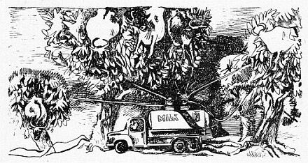 Это случилось на тридцать шестой день. Кончились удобрения, и отец с Исааком поехали в город, чтобы пополнить запас. Марк остался поливать деревья и сторожить плантацию от любопытных. Одному ему было тяжело управляться, и поливка шла медленнее обычного. Внезапно он услышал громкое, очень громкое мычание с дальнего конца участка. Сначала ревела одна корова, потом заревела вторая, и пошло, и пошло – как будто на плантацию ворвалось стадо. Марк схватился за жердь и бросился туда, откуда раздавался рев. Теперь мычание слышалось над самой головой. Он оперся рукой о ствол дерева. Ствол вибрировал, как будто мычало дерево.