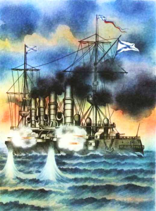 Каждую секунду может прогреметь взрыв. Взмах руки – и стальная раскалённая болванка летит в воду. Но вот новый взрыв – и отважный матрос сам падает, смертельно раненный. Ночью, когда русская эскадра перестала уже существовать, «Аврора», отбиваясь от атак японских миноносцев, вышла из боя. В плен она не сдалась.