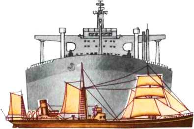 Первое океанское нефтеналивное судно «Глюкауф» (1886 г.) на фоне супертанкера «Юниверс айрленд». 1968 г.
