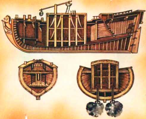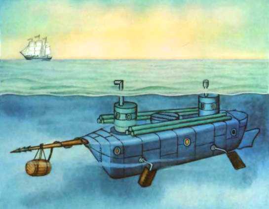 Первым, кто попытался это сделать, был голландец Корнелиус Ван Дреббель. Переехав в Англию, он сумел заинтересовать своим проектом короля и в 1620 году построил из дубовых досок, скреплённых железными обручами, лодку. С виду она была похожа на бочку, но имела заострённые нос и корму. Снаружи лодку обтянули бычьей кожей, пропитанной жиром. Приводилась в движение она семью парами вёсел. Лодку испытывали на реке Темзе, и, как утверждают свидетели, погрузившись на глубину три метра, она проплыла несколько минут невидимой. Легенда говорит, что затем в ней погружался в воду даже сам король! Вряд ли, конечно. Темно в лодке-бочке, душно, страшно!