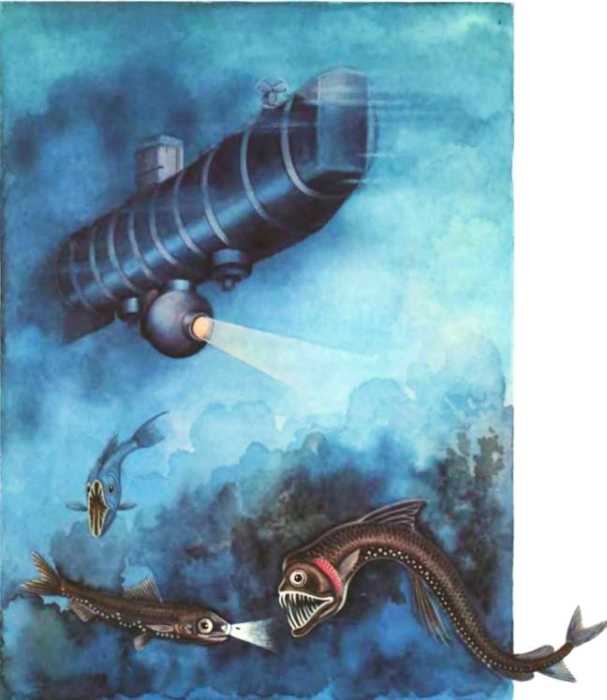 И тогда за стеклом вспыхнули голубые и зелёные огоньки: приближались глубоководные существа. Из мрака то и дело возникали горящие голубым пламенем глаза, огоньки-приманки на стебельках-выростах, зубы, светящиеся как натёртые фосфором лезвия ножей.