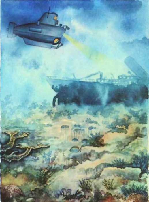 Огромный корабль, разломанный на две половины, лежал перед ними. Как скалы, возвышались его борта. Стаи рыб заплывали в открытые люки и иллюминаторы. Рухнувшие мачты и трубы лежали на палубе, как поваленный лес. В бортах зияли пробоины, похожие на пещеры.