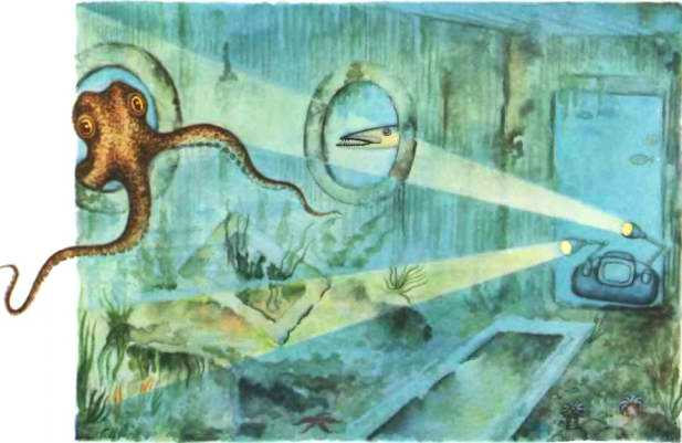 Извиваясь, проплывали рыбы, похожие на ленты. Тускло светясь, то собирались стайкой, то рассыпались по сторонам рачки-креветки. Пронёсся увешанный огоньками десятирукий кальмар. Мир, который всегда был загадкой для человека, лежал за стеклом в одном шаге от наблюдателя.