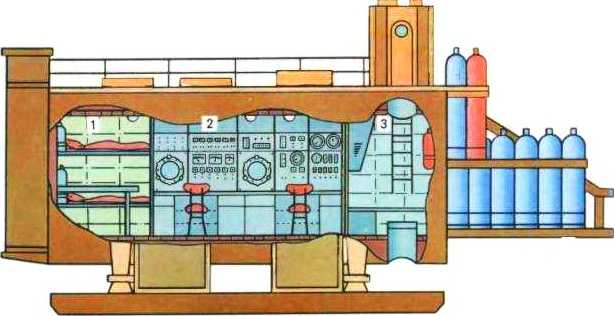 Подводная лаборатория «Черномор-2». 1 – кубрик; 2 – рабочий отсек; 3 – водолазный отсек