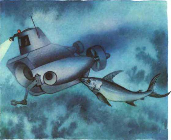 И тогда в бледном свете, которым был окружён аппарат, появилось, отделившись от лодки, странное сооружение. Плоский ящик, размером с небольшой чемодан; тонкий кабель, по которому передаётся ток для крошечных электромоторов и винтов; выпуклый глаз телевизионной камеры… Робот уверенно нырнул в чёрное устье пробоины, включил свой маленький прожектор – и тогда на экране перед командиром в лодке появилось изображение разрушенной каюты.