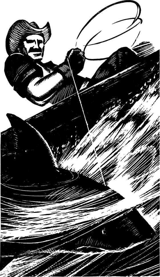 Зачерпнув левой, рукой воды, он смочил лицо и принялся сматывать лесу. Теперь он вел акулу, и та покорно уступала его воле. Вот знакомая тень снова появилась под лодкой. Из воды показался косой плавник. Франциско нащупал рукой стальной болт – один из четырех, которыми мотор был прикреплен к днищу. Свернув шнур петлей, он набросил его на болт.