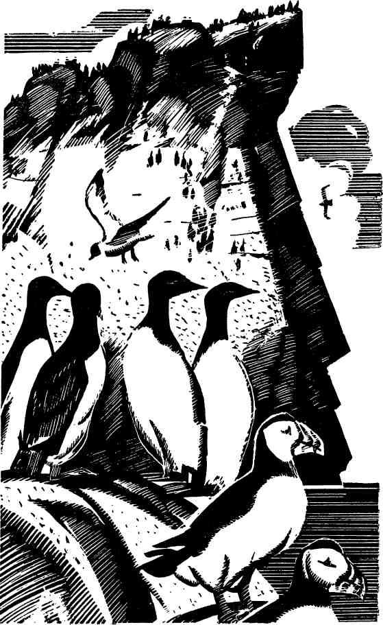 У маленького топорика детство иное. Первые дни проводит он не под открытым небом, как чайка, а в глубине норы, на подстилке из сухой травы и перьев. Подрастет, начнет выбираться на свет, расхаживать у входа в нору. И вот настал день: подбадриваемый родителями, устремляется пешком через гальку, через обломки камней – к воде! Добежал до воды, упал, заработал лапками – поплыл. Прочь от берега! Больше не вернется сюда в этом году маленькая красноносая птица. Уплывет в открытое море, будет там расти, откармливаться, взрослеть среди кочующих рыбьих стай и холодных свинцовых волн.
