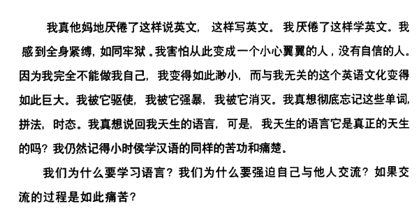 Мне надоело, что я так ужасно говорю по-английски. Мне надоело, что я так ужасно пишу по-английски. Я ощущаю себя связанной по рукам и ногам, мне кажется, что я живу в тюрьме. Я боюсь, что превратилась в человека, который всегда думает о том, что и как сказать, и от этого потеряла уверенность в себе, потому что не могу быть самой собой. Я стала такой маленькой, такой незначительной – а окружающая меня английская культура становится необъятной. Она поглощает меня, насилует меня. Господствует надо мной. Мне хочется – но я не могу – забыть про всю эту лексику, про глаголы и времена, я хочу вернуться в свой собственный язык. Но разве мой родной язык так уж прост? Я еще не забыла, как мучилась в школе, когда мы заучивали иероглифы.