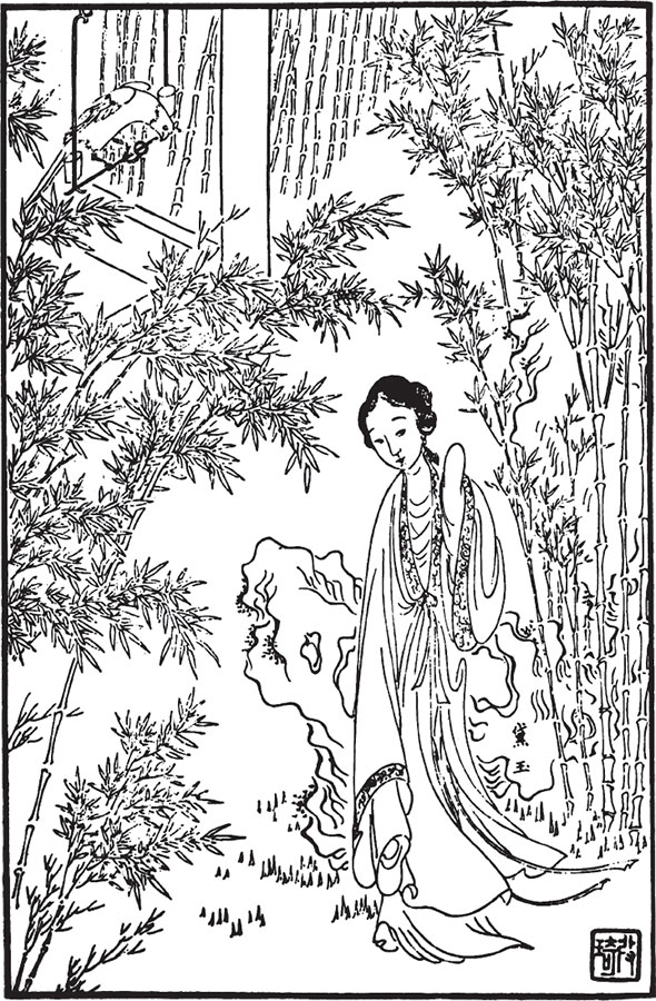 Тут из внутренних покоев в сопровождении нескольких молодых и старых служанок вышла какая-то красавица. Наряжена она была не так, как девушки: расшитые узорами одежды на ней сверкали, как у феи. Сложенные узлом волосы были перевиты нитями с жемчугом и заколоты шпильками в виде пяти жемчужных фениксов, обративших свои взоры к сияющему солнцу, на шее – ожерелье с подвесками в виде свернувшихся в клубок золотых драконов; на молодой женщине была узкая атласная кофта, вытканная золотыми бабочками; на фоне ярких цветов, поверх нее – накидка из темно-серого серебристого набивного шелка и креповая юбка с цветами по зеленому полю. Над треугольными, слегка раскосыми глазами изгибались брови, подобные листочкам ивы, свисавшим с ветки. Во всей фигуре женщины чувствовалась легкость и стремительность, густо напудренное лицо выглядело добродушно, и хотя алые губы были сжаты, на них играла улыбка.