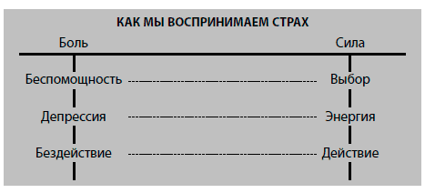 И правда, состояние страха не является сутью проблемы – намного важнее то, как мы ведемсебя в этом состоянии. Для одних людей страх не играет практически никакой роли, других же он полностью парализует. Первые воспринимают страх с позиции силы (готовность делать выбор, энергия и действие), а последние – с позиции боли (беспомощность, депрессия и паралич).